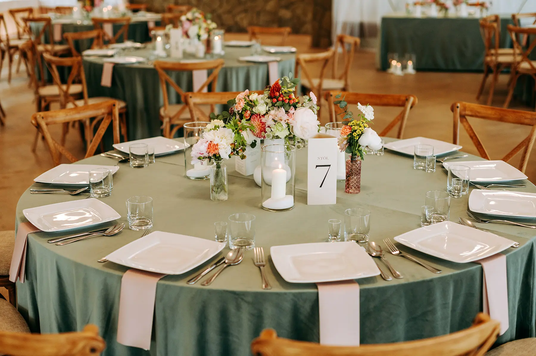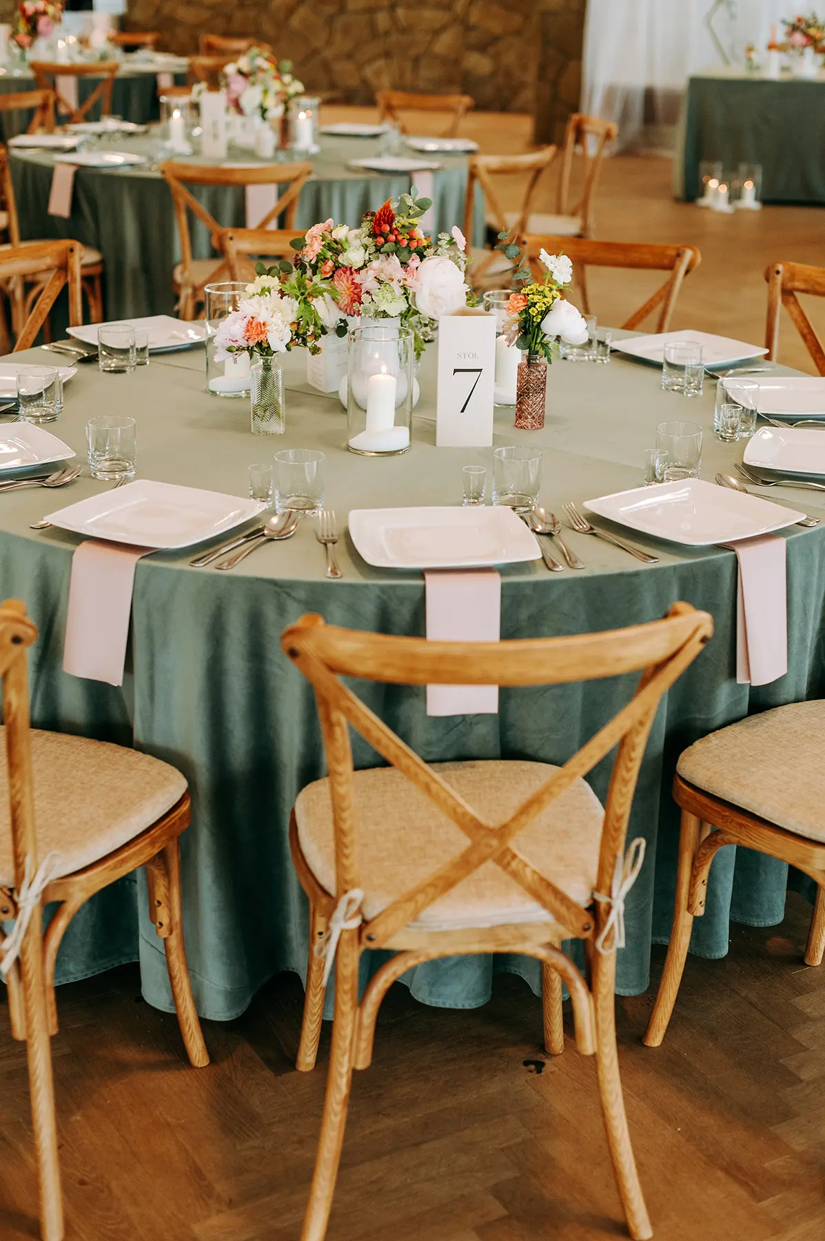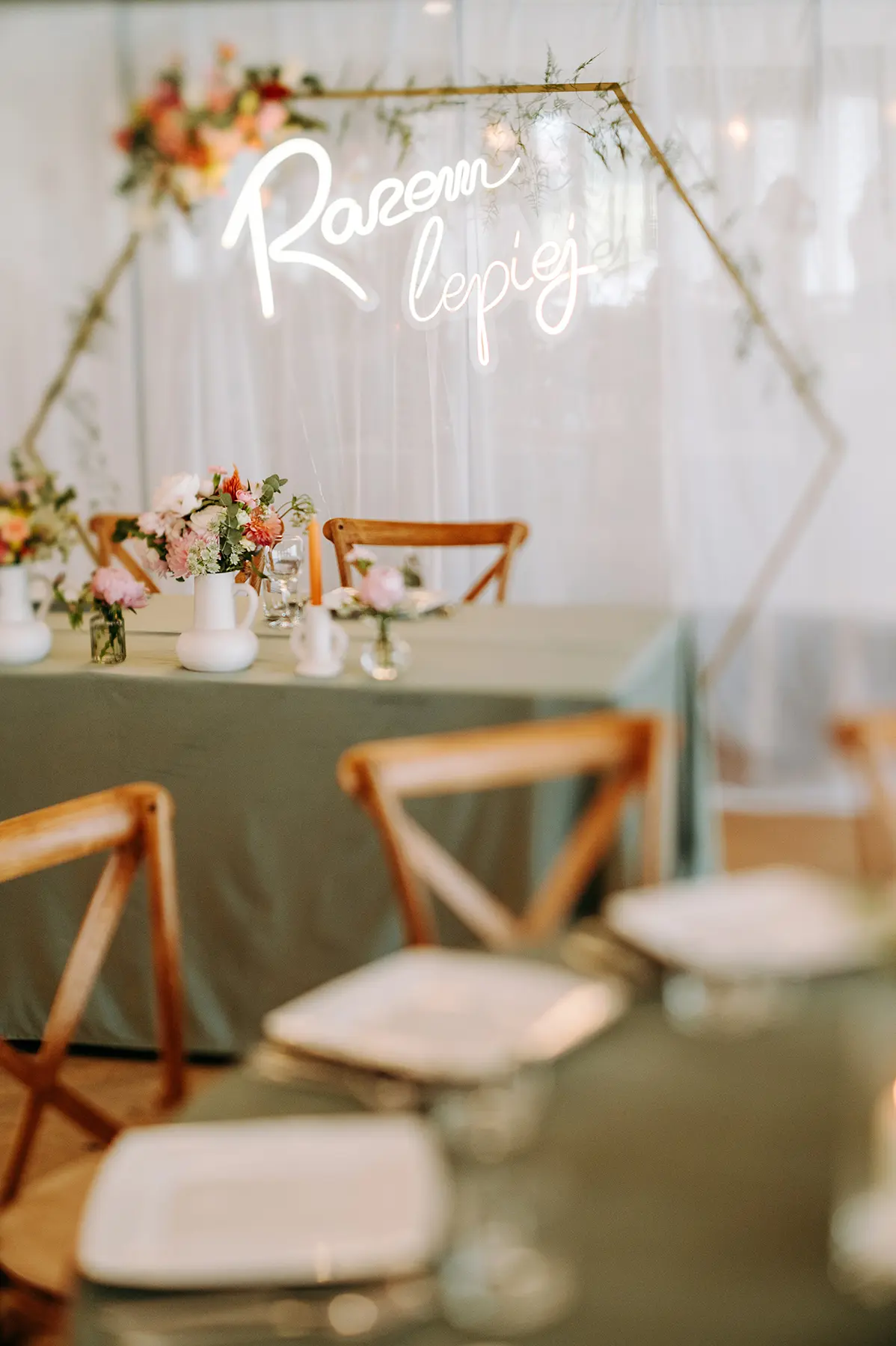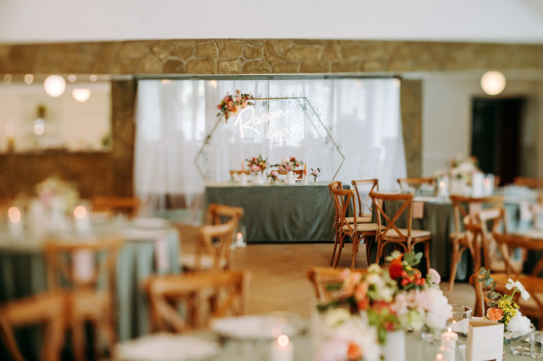 Parze zależało również, aby możliwie jak najbardziej ograniczyć ich ekspozycję i “bycie na świeczniku”- udało się podmienić lub stonować tradycyjne elementy wesela na tyle, aby nowożeńcy czuli się komfortowo. Dzięki otwartości lokalu, udało nam się nieco zejść z utartych do tej pory szlaków i wpłynąć na serwis czy sposób obsługi przyjęcia, co świetnie zadziałało, spełniając nasze oczekiwania.